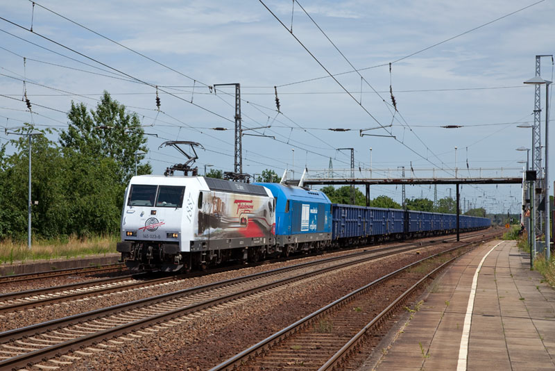| Donnerwetter, kaum angekommen, kam diese tolle Fuhre der PRESS: die Fleischmann-Lok 145 023-6 mit der Diesellok 253 015-8 und einem Eaos-Wagenzug. Saarmund, 29. Juni 2012 | ||