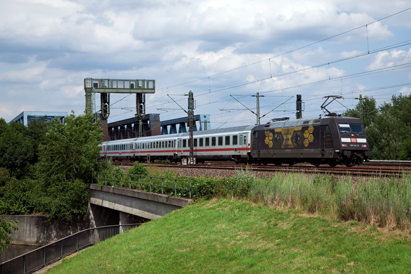 | Der InterCity 2213 mit der "Azubi I"-Werbelok, der 101 141-0. Hamburg Süderelbbrücken, 1. Juli 2012 |