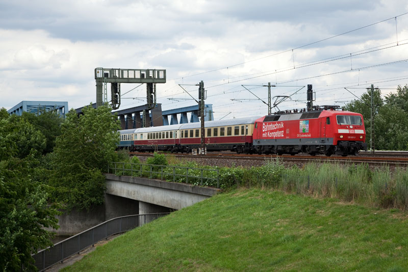 | Die 120 501-2 von DB Systemtechnik mit dem historischen IC 2417 "Hanseat" nach Köln. Hamburg Süderelbbrücken, 1. Juli 2012 |