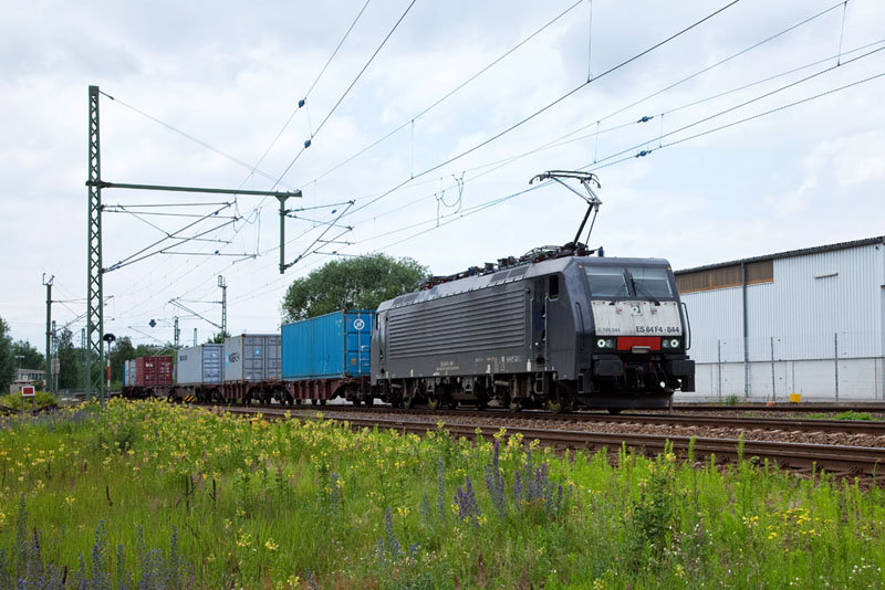 | Von Hamburg-Waltershof über Kattwyk kommend fuhr die Leihlok ES 64 F4-844 mit einem Containerzug auf die Berliner Schiene. Hamburg-Hohe Schaar, 1. Juli 2012 | ||
