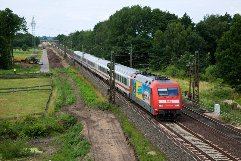 | Der InterCity 2373 auf dem Weg nach Hannover mit der 101 037-0 "Klagenfurt". Grevelau, 3. Juli 2012 |