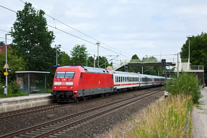 | Die 101 075-0 rauschte mit ihrem IC 2327 durch die kleine Ortschaft. Klecken, 3. Juli 2012 |