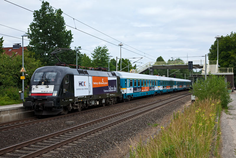 | Der ab Ende Juli verkehrende private HKX auf Schulungsfahrt mit der ES 64 U2-034 und den ALEX-Wagen! Klecken, 3. Juli 2012 |