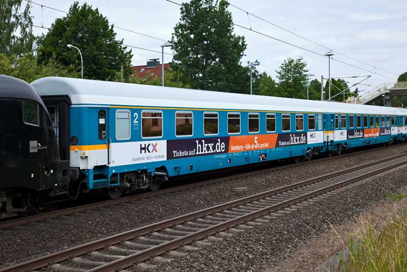 | Die ALEX-Wagen wurden für den HKX beklebt – alles Avmz – also 1. Klasse! Klecken, 3. Juli 2012 |