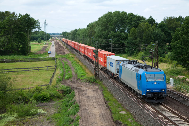 | Die für die ITL fahrende 185 522-0 mit einem "Hamburg Süd"-Containerzug. Grevelau, 3. Juli 2012 |