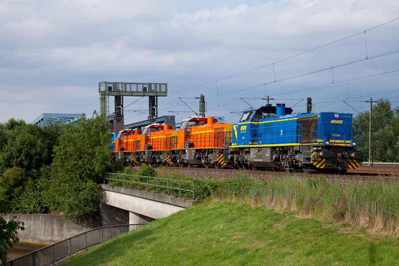 | Wow, ein langer VOSSLOH-Lokzug, die MWB V 2305 mit neuen Loks für die COLAS Rail und mehr! Hamburg Süderelbbrücken, 3. Juli 2012 |