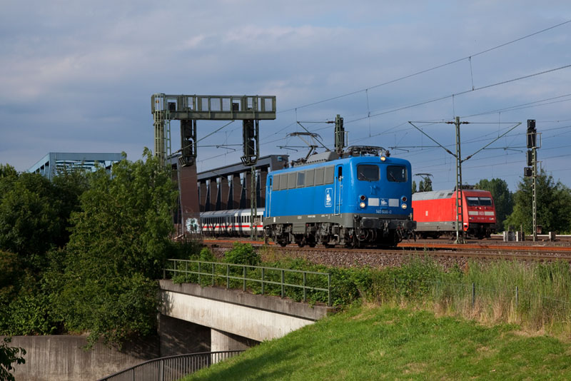 | Potzblitz, die zweite blaue 140 der PRESS, die 140 038-0 auf dem Weg nach Unterelbe Seehafen. Hamburg Süderelbbrücken, 3. Juli 2012 |