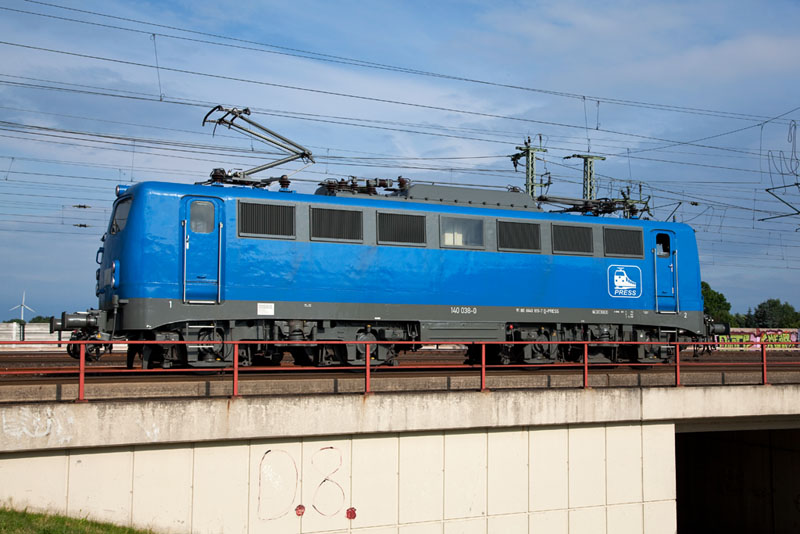 | Ein Seitenschuss auf die ehemalige 140 851, die jetzt als 140 038-0 der PRESS läuft. Hamburg Süderelbbrücken, 3. Juli 2012 |