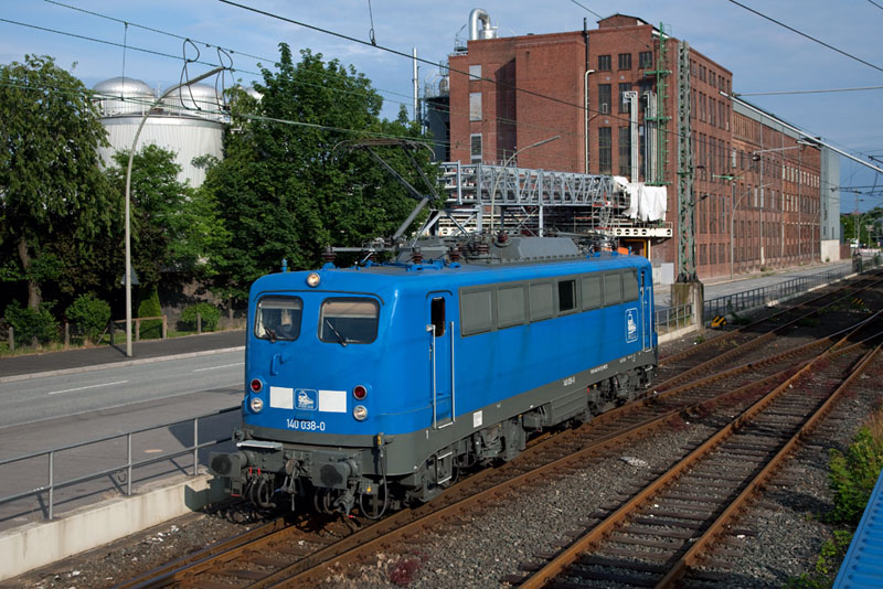 | Die 140 038-0 der PRESS bei der Einfahrt in den Seehafenbahnhof. Hamburg-Unterelbe Seehafen, 3. Juli 2012 |