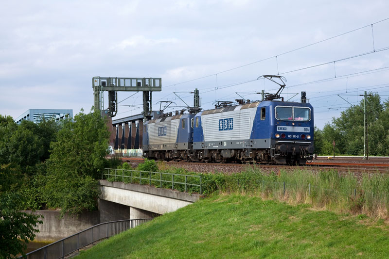 | Ein RBH-Tandem aus 143 191-5 und 143 573-4 rollte südwärts. Hamburg Süderelbbrücken, 3. Juli 2012 |