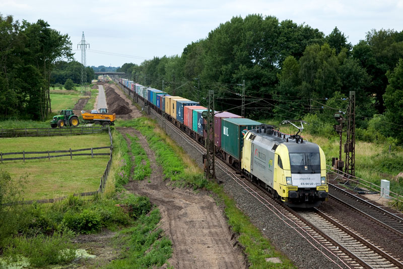 | Ein Containerzug mit der ES 64 U2-011 der TX Logistik passierte die Baustelle zum dreigleisigen Ausbau. Grevelau, 3. Juli 2012 |