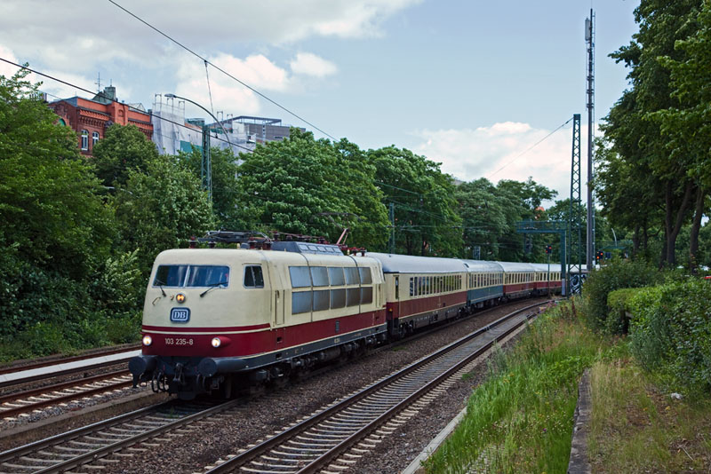 | Mit dem vierten und letzten Sonderzug TEE 8 aus Köln zu den "Cunard Days" kam die 103 235-8 mit dem "Rheingold". Hamburg-Rotherbaum, 15. Juli 2012 |