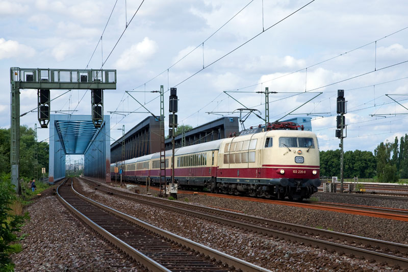| Mit dem TEE 9 fuhr die 103 235-8 wieder zurück nach Köln. Hamburg Süderelbbrücken, 15. Juli 2012 |
