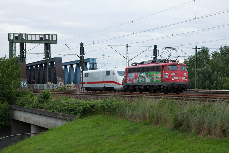 | Die Ferrero-Werbung beklebte 110 491-8 schleppte den ICE-Triebkopf 401 064 als 46113 nach Nürnberg. Hamburg Süderelbbrücken, 15. Juli 2012 |