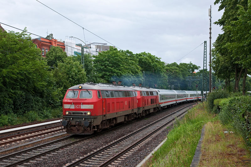 | 218 344-0 und 218 315-0 beschleunigten ihren Westerland-IC 2074 bei der Ausfahrt aus dem Bahnhof Dammtor. Hamburg-Rotherbaum, 15. Juli 2012 |