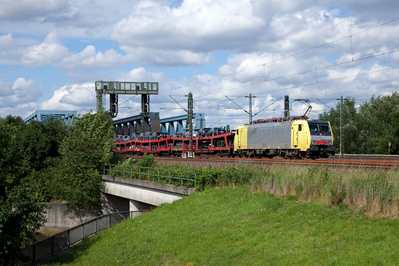 | Die MRCE ES 64 F4-015 mit dem Autozug 13383 von Hamburg-Altona nach Bozen in Italien. Hamburg Süderelbbrücken, 15. Juli 2012 |