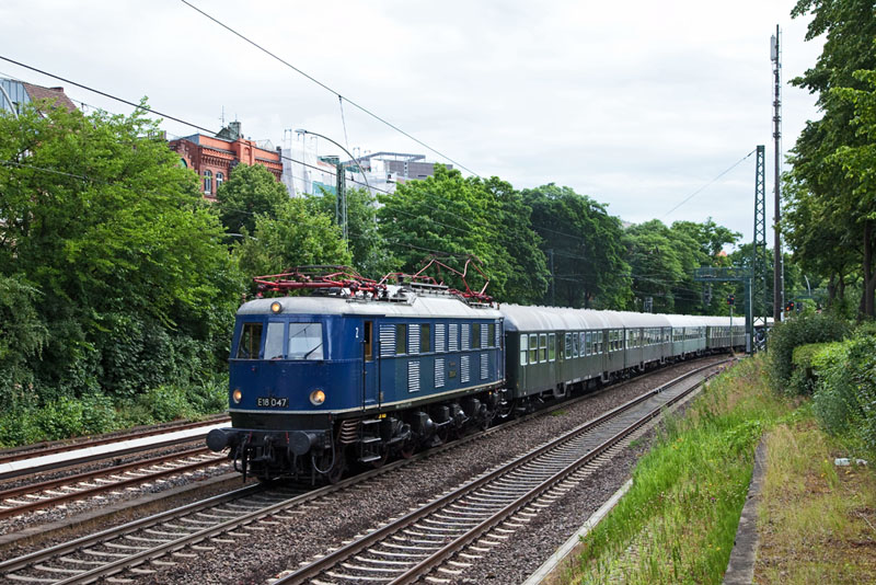 | Mit dem zweiten Sonderzug DPE 5936 zu den "Cunard Days" kam die E18 047 aus Gießen. Hamburg-Rotherbaum, 15. Juli 2012 |