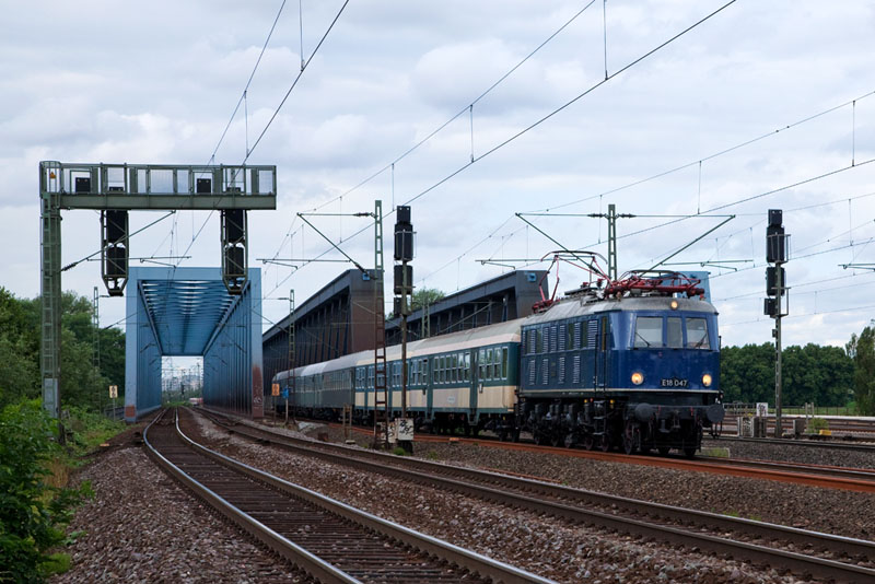 | Die E18 047 brachte ihren Sonderzug DPE 5939 von Hamburg nach Gießen zurück. Hamburg Süderelbbrücken, 15. Juli 2012 |