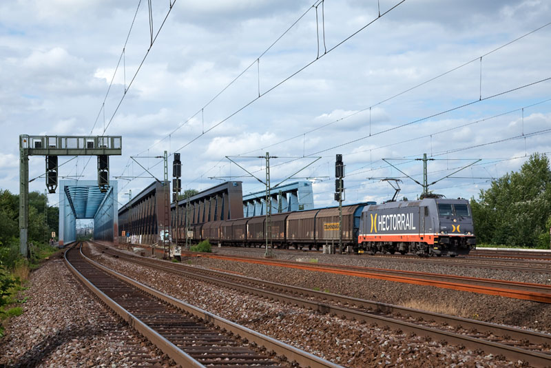 | Einen ScandFibre Logistics-Zug nach Dortmund hatte die "Galore" alias 241.008 der HECTORRAIL am Haken. Hamburg Süderelbbrücken, 15. Juli 2012 |