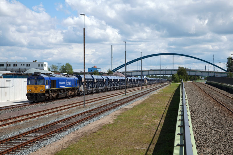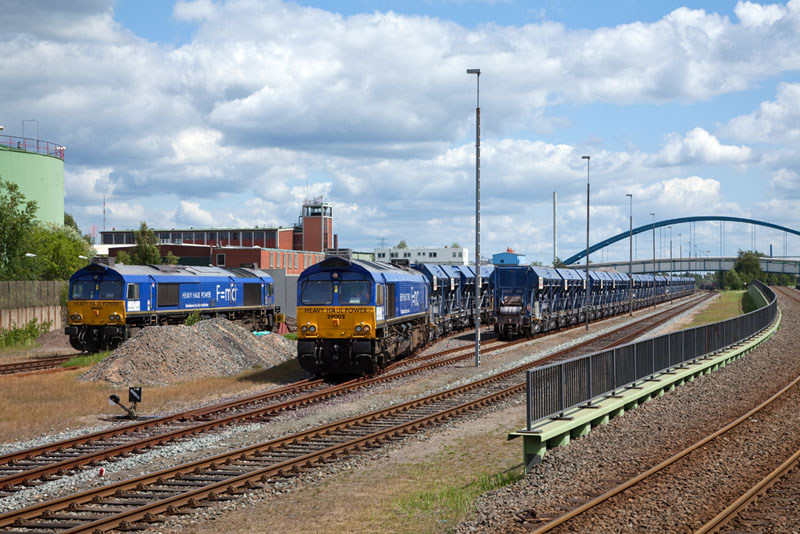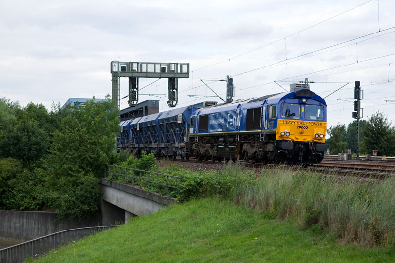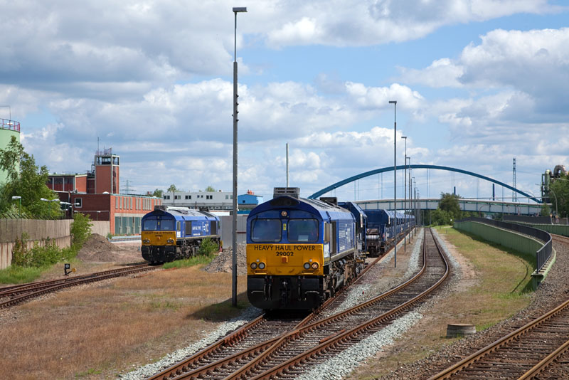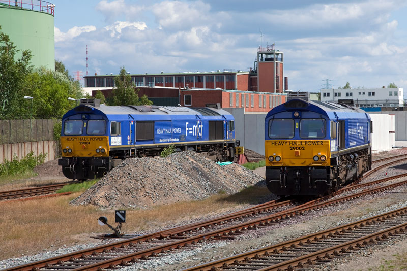 | Zwei rassige Anglo-Kanadierinnen der Heavy Haul Power International: 29001 und 29002 am neuen Kiesterminal. Hamburg-Peute, 15. Juli 2012 |