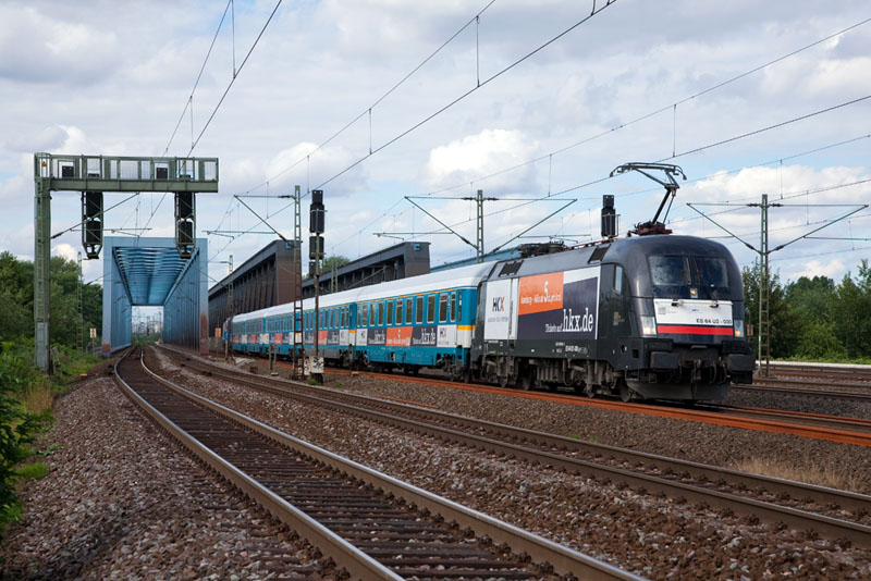 | Die ES 64 U2-030 der Ostseeland-Verkehre mit dem HKX-Schulungszug DPF 1804 nach Köln. Hamburg Süderelbbrücken, 15. Juli 2012 |