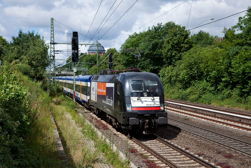 | Mit dem Schulungszug DPF 1802 Hamburg - Köln des neuen HKX kam die ES 64 U2-034. Hamburg-Rotherbaum, 15. Juli 2012 |