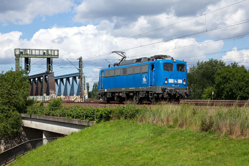 | Die 140 038-0 der PRESS fuhr über Hamburg-Harburg nach Bremen. Hamburg Süderelbbrücken, 15. Juli 2012 |