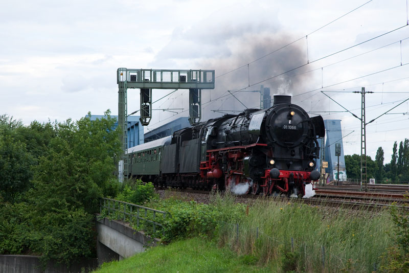 | Die Ulmer 01 1066 mit ihrem Sonderzug DPE 5922 nach Oberhausen. Hamburg Süderelbbrücken, 15. Juli 2012 |