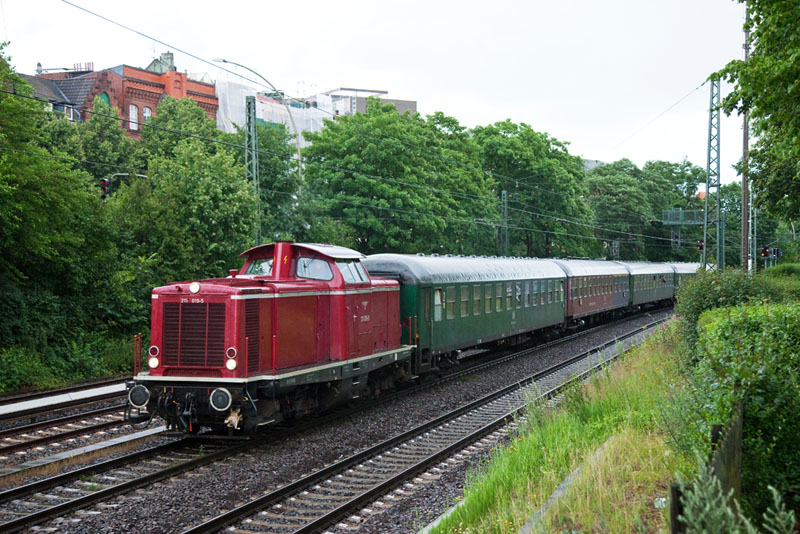 | Mit dem ersten Sonderzug Vienenburg - Hamburg zu den "Cunard Days" kam die Vienenburger 211 019-5. Hamburg-Rotherbaum, 15. Juli 2012 |