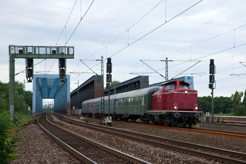 | Mit dem letzten Sonderzug dieselte die 211 019-5 nach Vienenburg zurück. Hamburg Süderelbbrücken, 15. Juli 2012 |