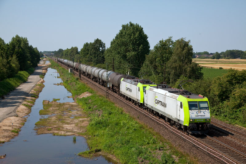 | Wow, eine CAPTRAIN-Doppeltraktion aus 185-CL 005 und 185 543-6 vor einem Kesselwagenzug. Borstel, 25. Juli 2012 |