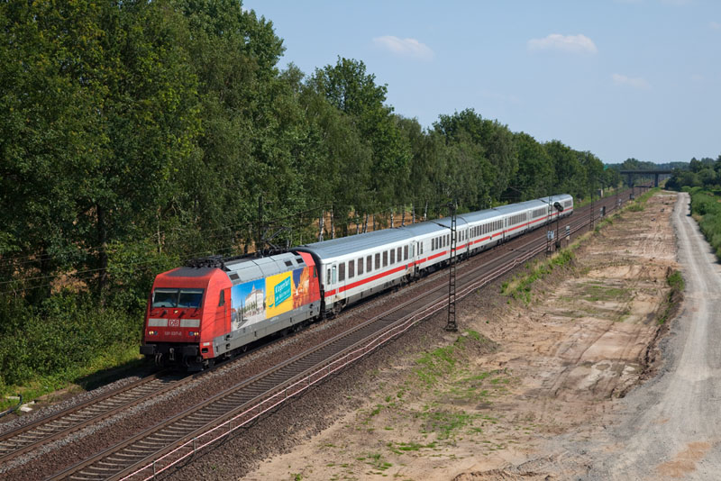 | Die "Klagenfurt"-Werbelok 101 037-0 mit ihrem InterCity 2374 nach Hamburg. Borstel, 25. Juli 2012 |