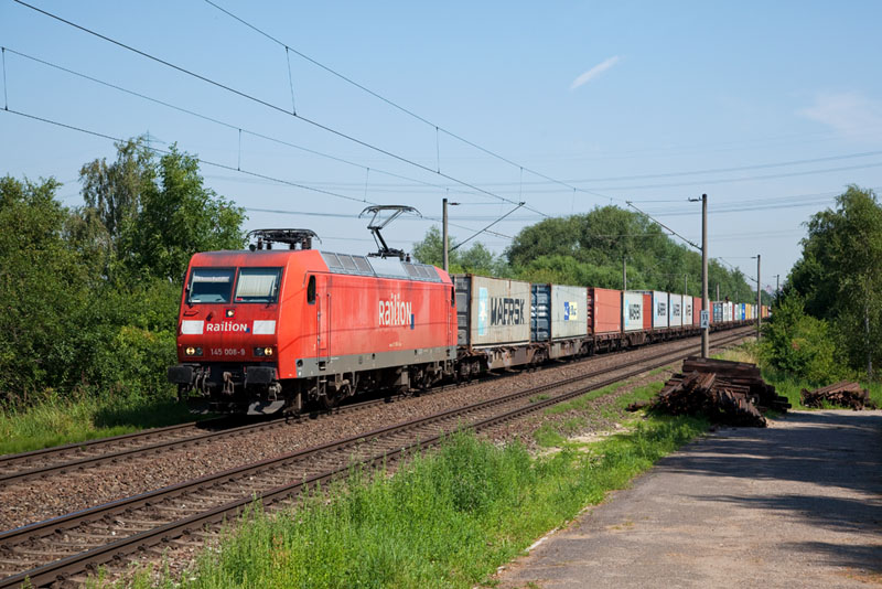 | Die farblich verblichene 145 008-9 mit dem alten Railion-Logo vor einem Containerzug. Hamburg-Moorburg, 25. Juli 2012 |