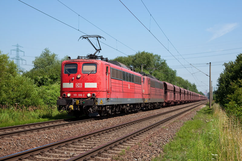 | Einen Erzbomber nach Beddingen hatten 151 106-2 und 151 113-8. Hamburg-Moorburg, 25. Juli 2012 |