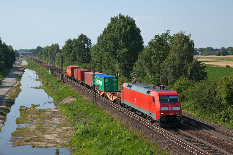 | Recht frisch sah der Lack der 152 040-2 noch aus, als die mit einem Containerzug südwärts fuhr. Borstel, 25. Juli 2012 |