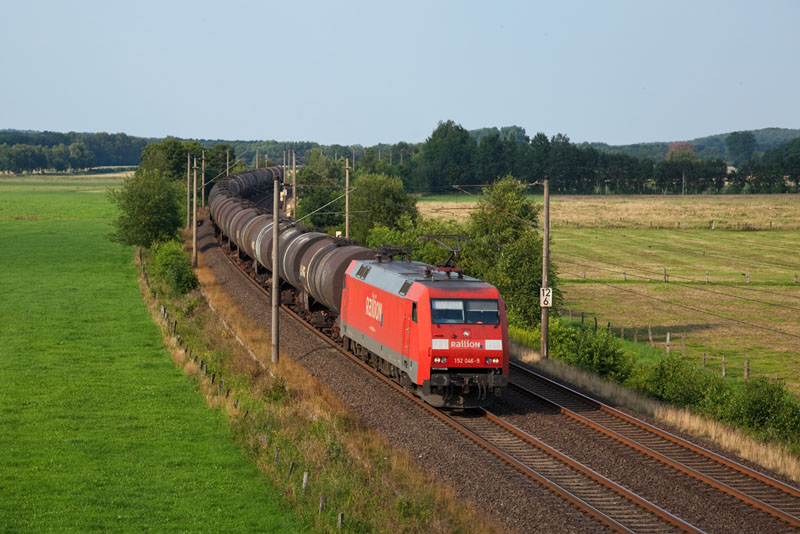 | Die 152 046-9 mit einem Kesselwagenzug. Ramelsloh, 25. Juli 2012 |