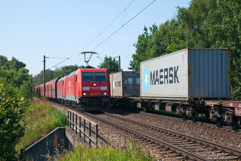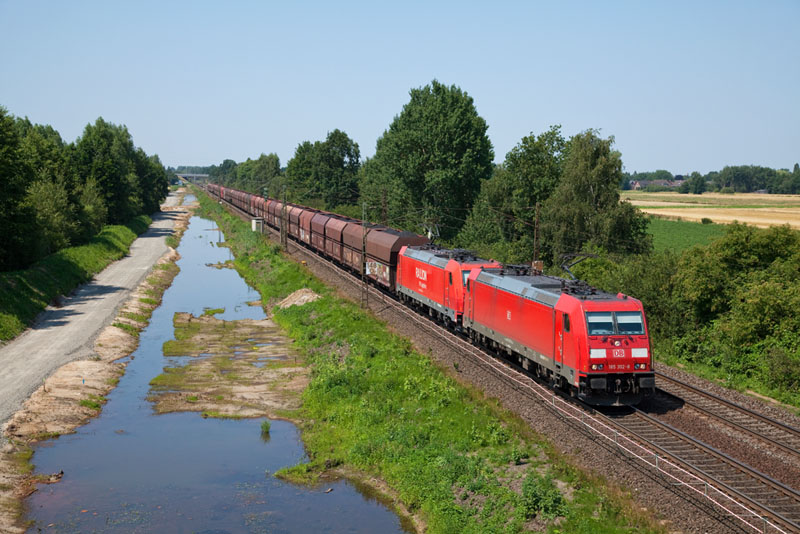 | Einen Kohlepark schleppten 185 392-8 und 185 254-0 südwärts. Borstel, 25. Juli 2012 |