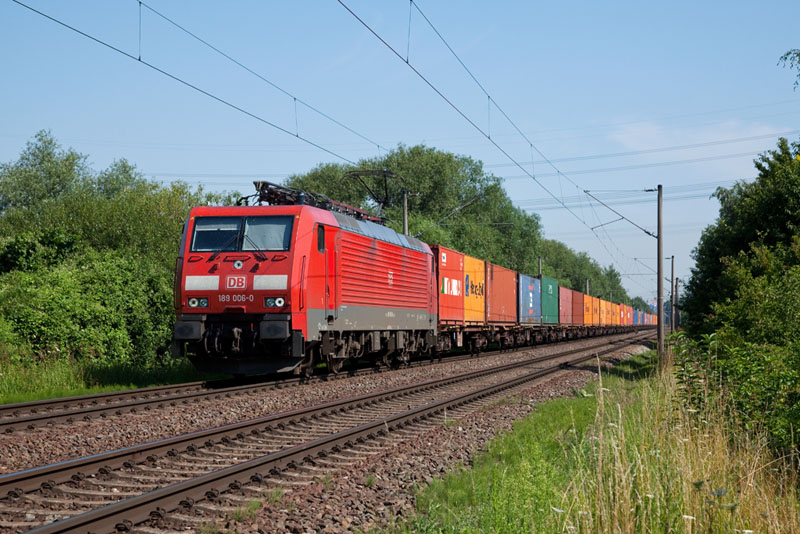 | Mit einem Containerzug aus dem Hafen kam die 189 006-0. Hamburg-Moorburg, 25. Juli 2012 |