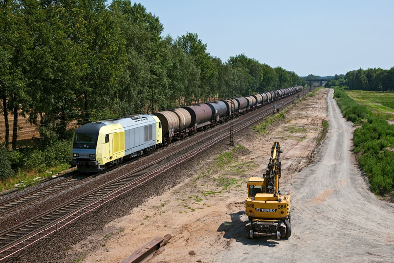 | Die für die CTL Logistics fahrende ER 20-002 mit einem langen Kesselwagenzug nach Hamburg. Borstel, 25. Juli 2012 |