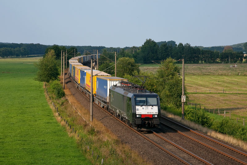 | Für die TX Logistik fuhr die ES 64 F4-280 der MRCE mit einem KLV-Zug aus Skandinavien. Ramelsloh, 25. Juli 2012 |