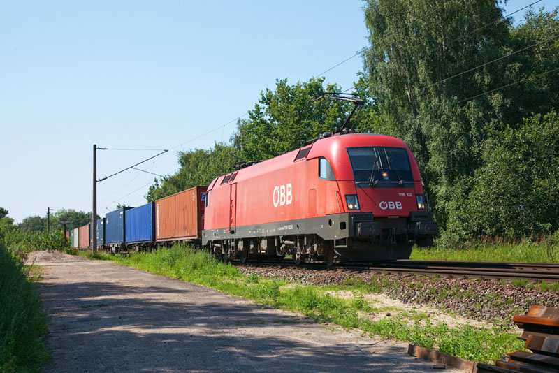 | Einen ÖBB-Taurus sieht man hier nicht mal alle Tage, die 1116 102 in den Hafen. Hamburg-Moorburg, 25. Juli 2012 |