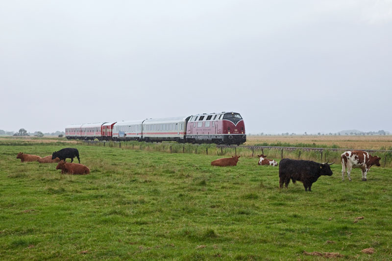 | Die Rindviecher liessen sich nicht von der V 200 mit ihrem Zug 22 nach Niebüll nicht stören. "Alte Schule", 29. Juli 2012 |