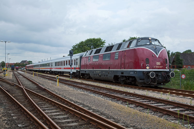 | Gleich nach der Ankunft in Niebüll fuhr die V 200 weiter in den Staatsbahnhof der DB. Niebüll, 29. Juli 2012 |