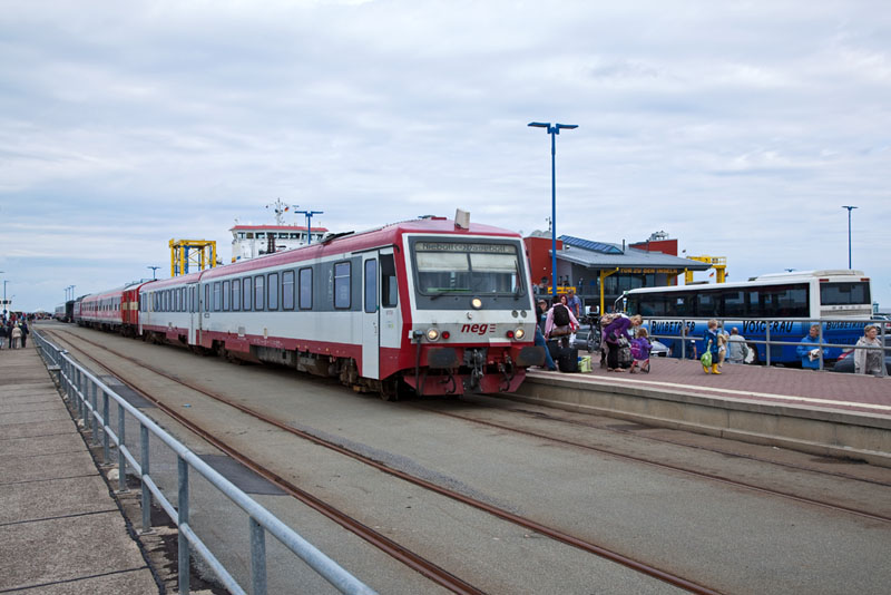 | Am Zugende war der VT 71 der NEG, der sobald als Zug 10 nach Niebüll zurückfuhr Dagebüll Mole, 29. Juli 2012 |