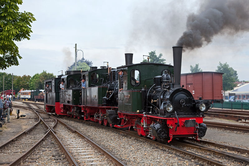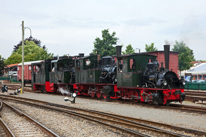 | Alle vier betriebsfähigen Dampfloks: FRANZBURG, HOYA, SPREEWALD und PLETTENBERG. Bruchhausen-Vilsen, 4. August 2012 |