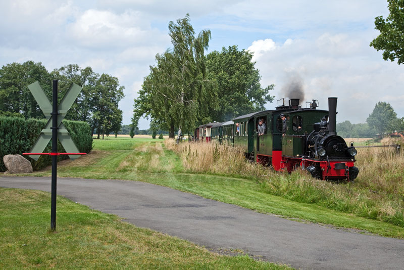 | Laut pfeifend passierte die SPREEWALD mit ihrem Zug P413 nach Asendorf den Bahnübergang. Bei Heiligenberg, 4. August 2012 |