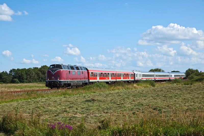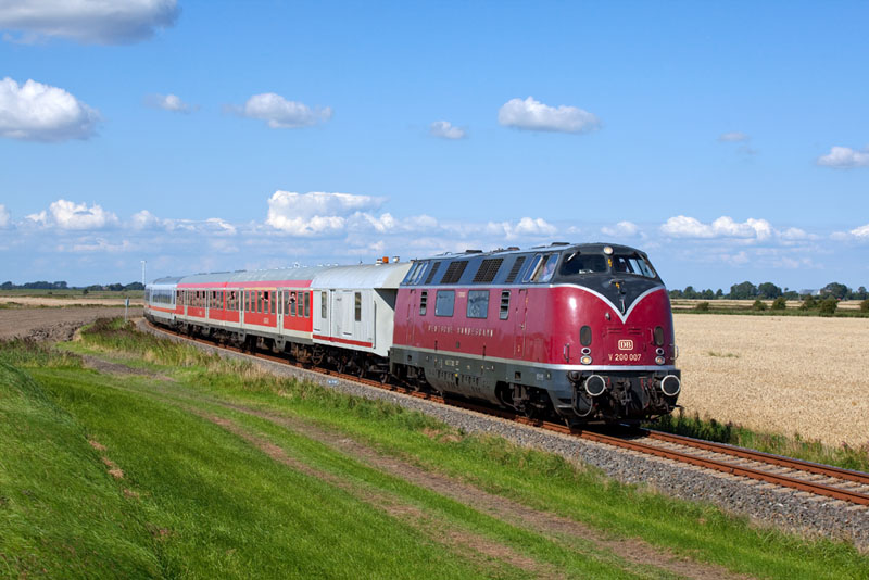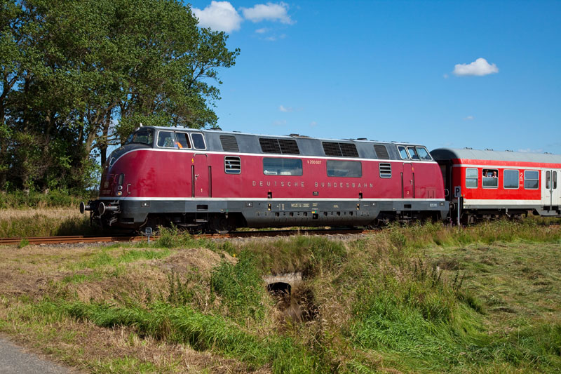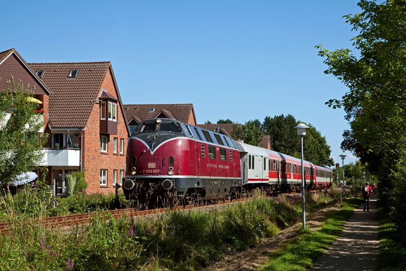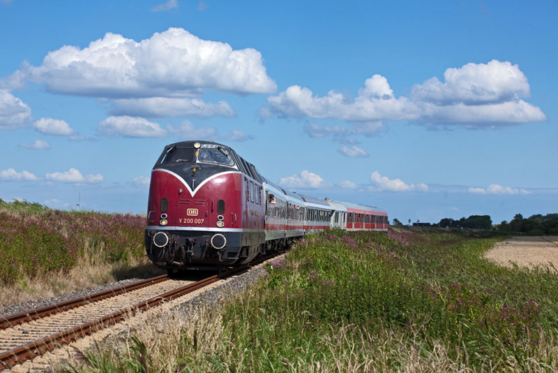 | Nordfriesisches Kaiserwetter und die V 200! Hier mit dem Zug 17 und IC-Kurswagen nach Dagebüll. Bei Dagebüll-Kirche, 12. August 2012 |