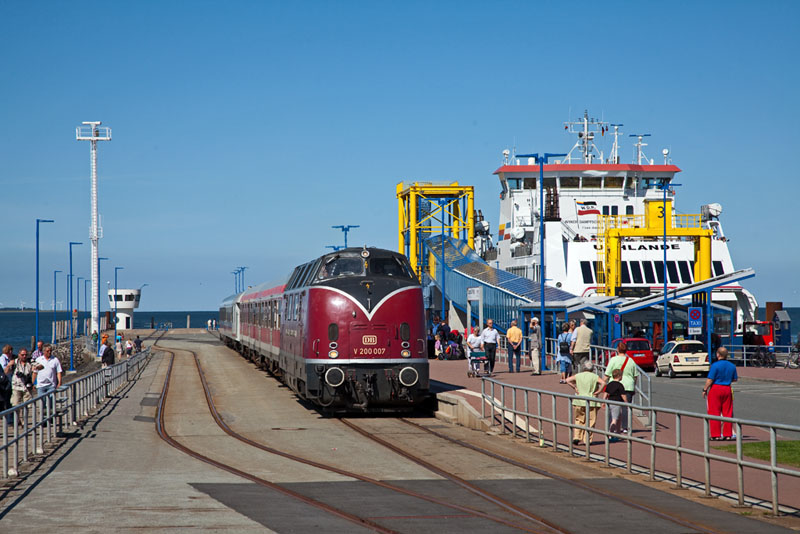 | Abfahrtsbereit steht die V 200 vor ihrem nächsten Zug E12 nach Niebüll. Jede Menge Schaulustige! Dagebüll Mole, 12. August 2012 |