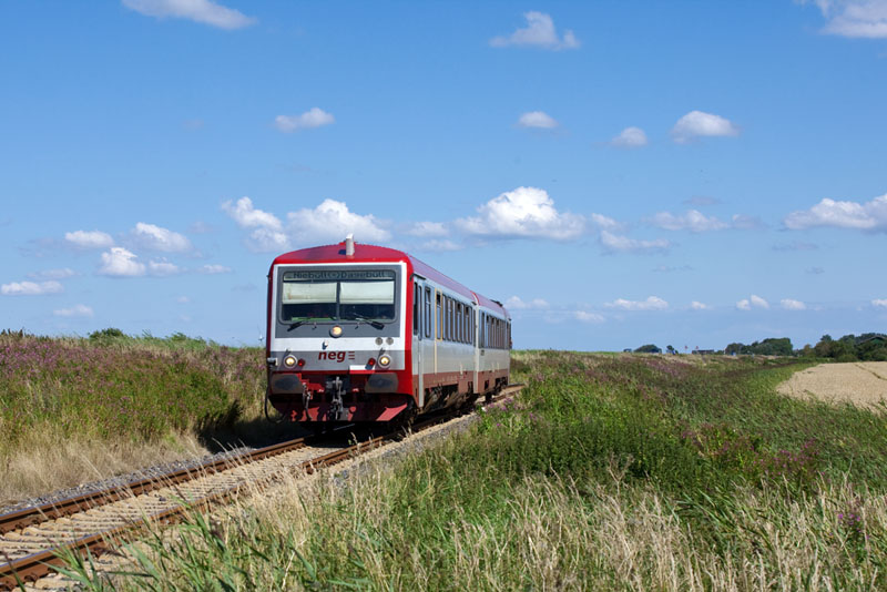 | Die anderen Zugleistungen absolvierte der ehemalige FKE-Triebwagen VT71. Bei Dagebüll-Kirche, 12. August 2012 |