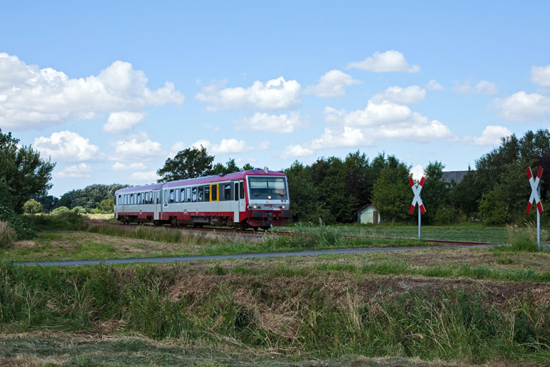 | Der einzige Wolkenschaden heute, der VT71 auf dem Weg nach Dagebüll. Moorhäuser, 12. August 2012 |